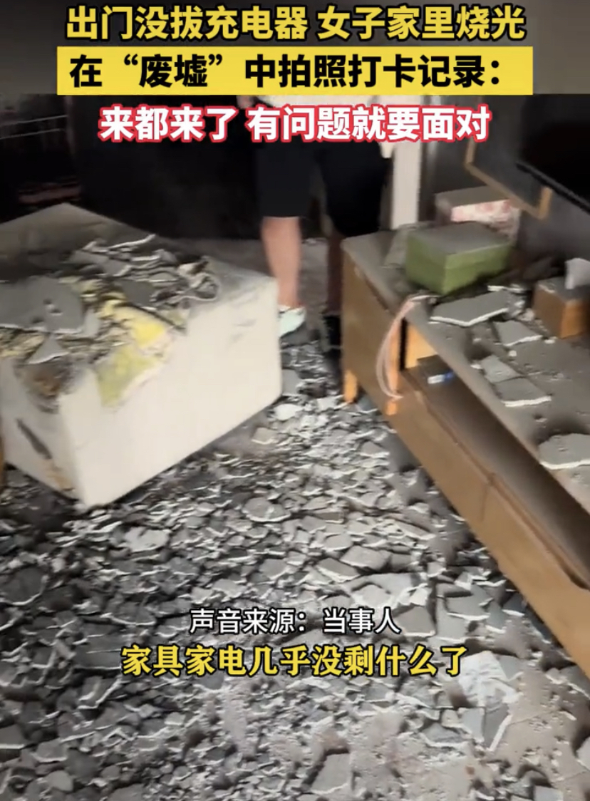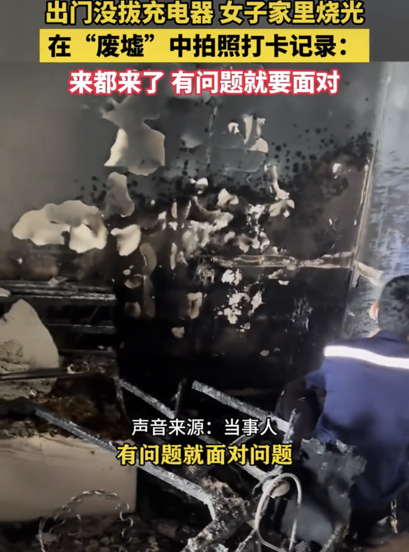 女子忘拔充电器,家里被烧光不忘拍照打卡,长相亮了